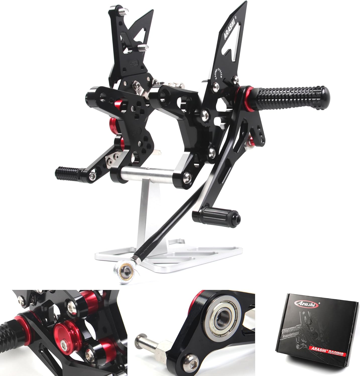 IMPROVED! Arashi Adjustable Footrest Version 2.0. Feature: Condition: 100% Brand New.Upgraded foot pegs are air-weight crafted.Upgraded Heel guard carries extra thickness. Enhanced knurled edge creates slip resistance. Engineered specifically for your bike with Arashi engraved. Customized shift linkage delivers accurate gearshift. Designed for precision fit and easy adjustment to suit your riding position. Control the brake light. External return spring for the brake pedal. Color: Lasting Finish. Anodized color surface. Color Option:Black Material: Superior strength. Billet 6061-T6 Aircraft grade Aluminum.For Kawasaki Ninja ZX10R ZX1000 2004-2005