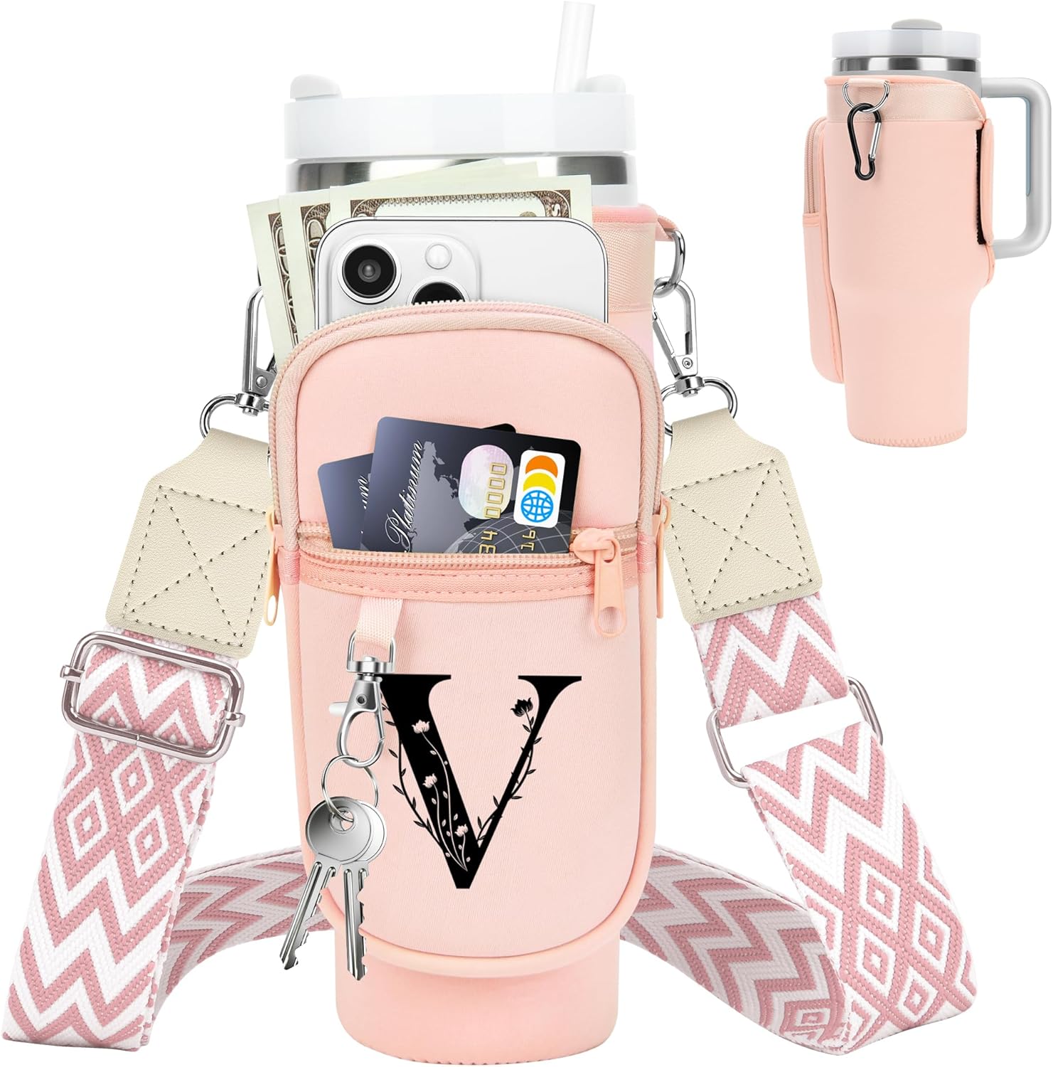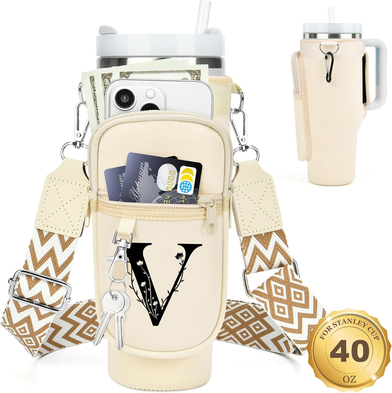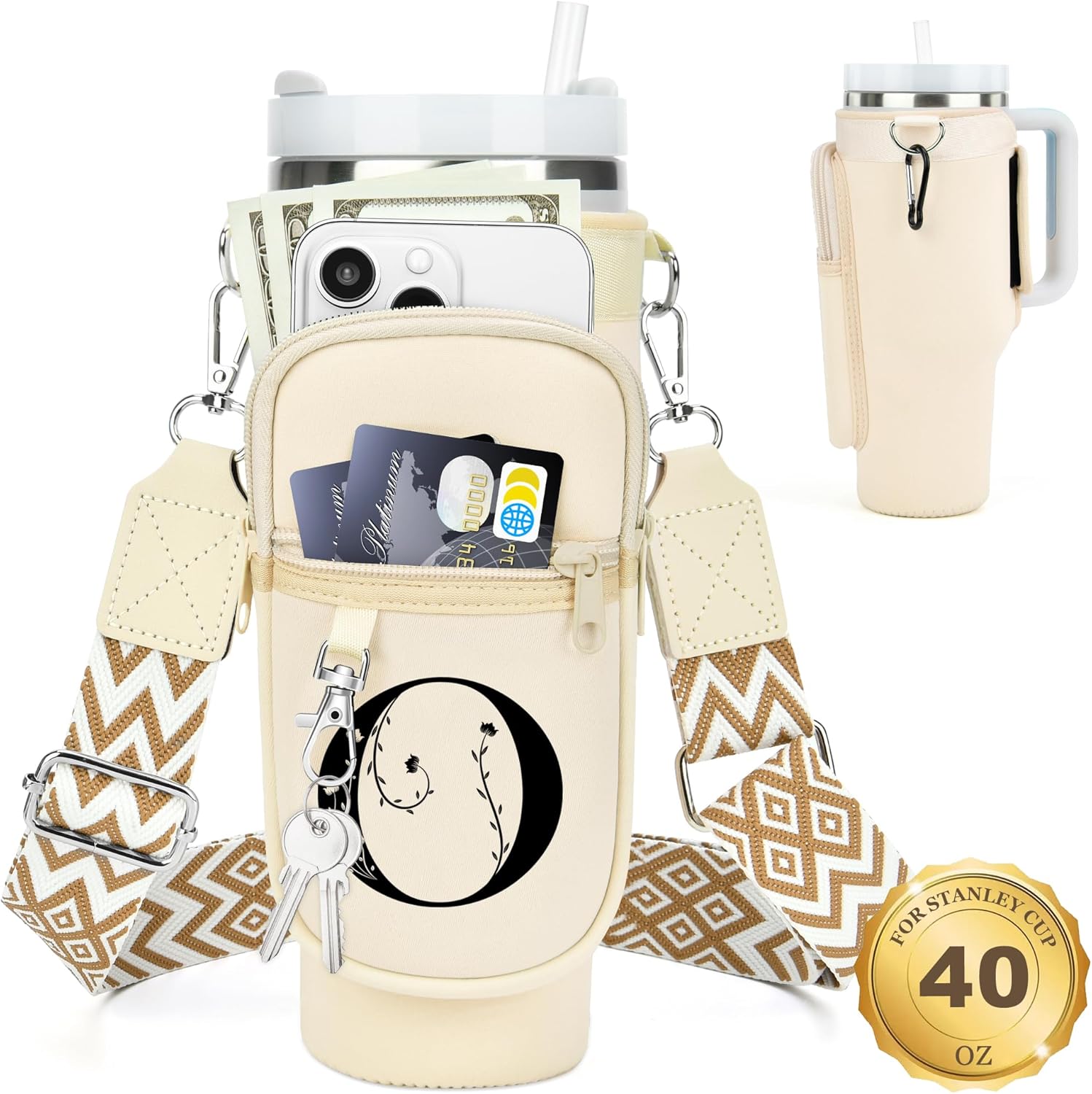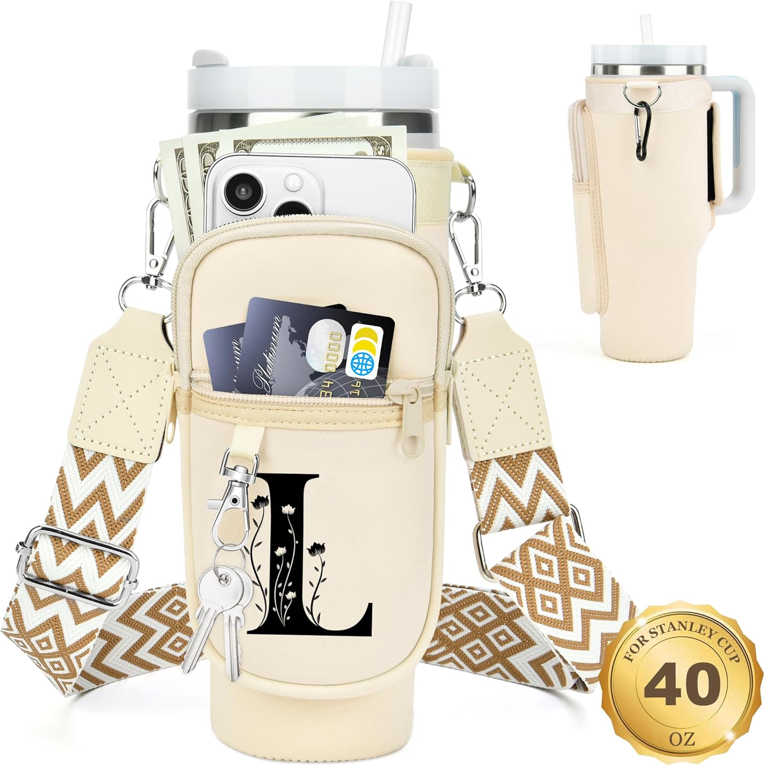 LOKASS for Stanley Cup Accessories 40 oz Water Bottle Carrier Bag with Phone Pocket for Stanley Tumbler Holder with Strap, Personalized Gifts with Floral Initial A-Z for Women/Girls/Stanley Cup Fans