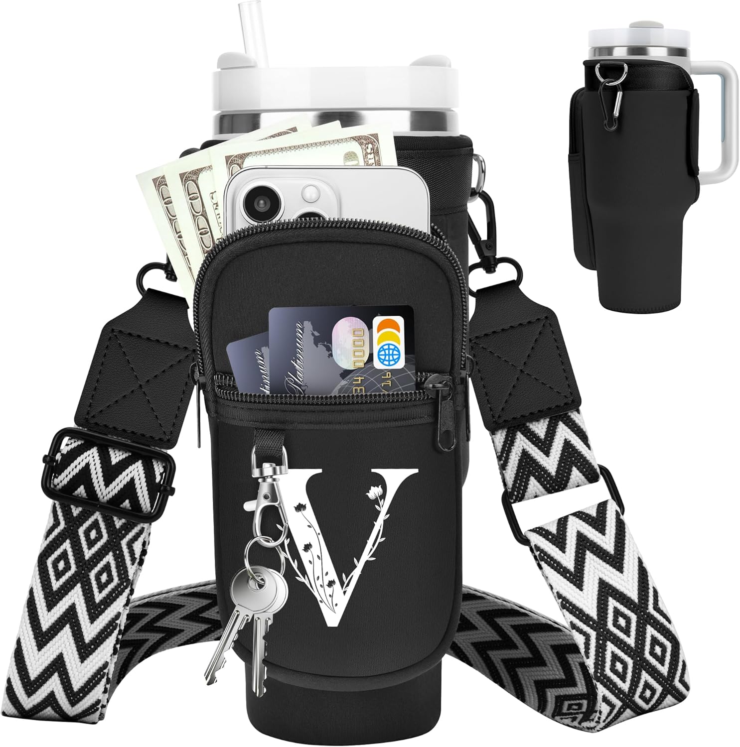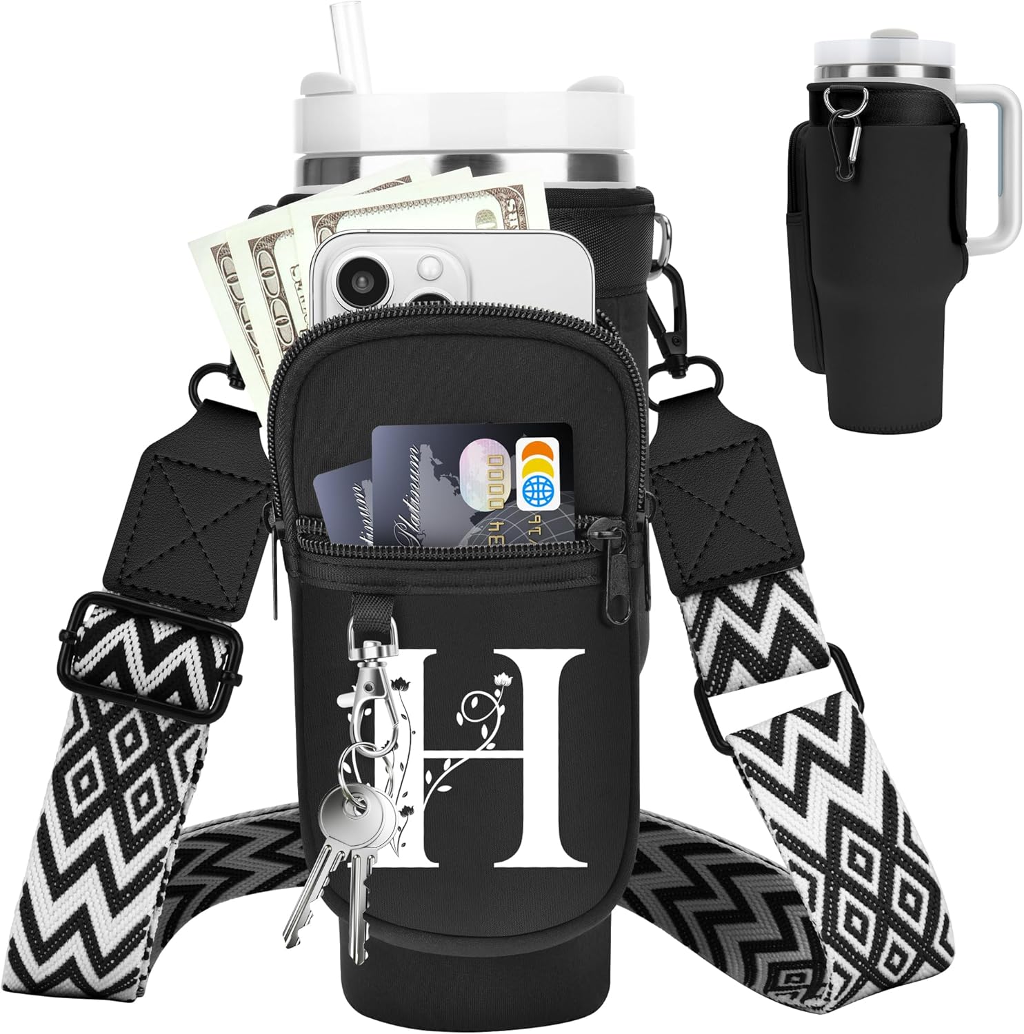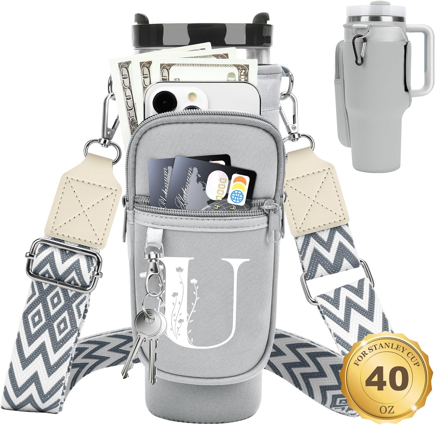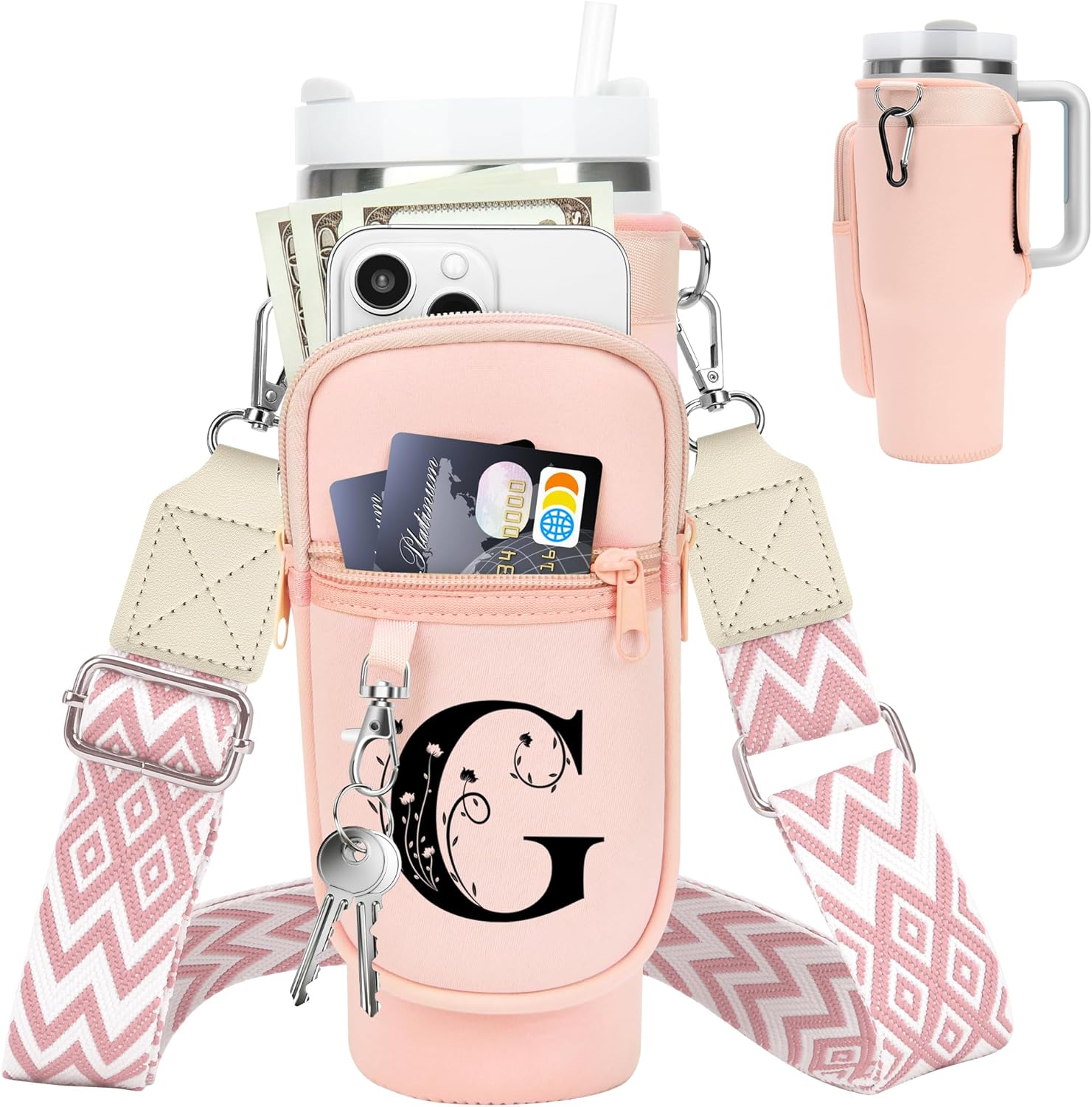 LOKASS for Stanley Cup Accessories 40 oz Water Bottle Carrier Bag with Phone Pocket for Stanley Tumbler Holder with Strap, Personalized Gifts with Floral Initial A-Z for Women/Girls/Stanley Cup Fans