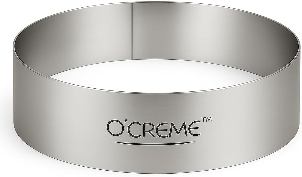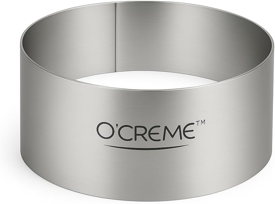 O'Creme Sturdy Stainless Steel Round Cake and Pastry RingMade of a single metal strip with secure welding joining one end to other end to form a ring in which to prepare and yield a round dessert with neat straight sides Bend resistance maintains roundness of ring when used responsibly, even with repeated use in commercial kitchens; ring is safe in dishwasher, oven and freezer Polished exterior and interior; 1/32 inch thick (20 gauge / 0.79 millimeters) — thick enough for durability but thin enough to cut out round piece from dough or sheet cake Grease interior of ring before use to make dessert easy to remove when it's ready; bottomlessness of ring also facilitates ease of release; if dessert is frozen, torch or blow-dry outside of ring to make removal of food product easy Buy rings of different sizes to form a tiered cake O'Creme is a brand that supports creativity, talent and passion. At O'Creme we know that creating and decorating perfect confections is all the more enjoyable and achievable with the right tools. We therefore ensure that our products are not only made of the finest quality materials but also designed to be simple and easy to use. O'Creme was founded by its owners after decades in the industry of culinary and confectionery arts. We perceived and are constantly working to meet the need for effective and practical tools crafted with the consumer in mind.