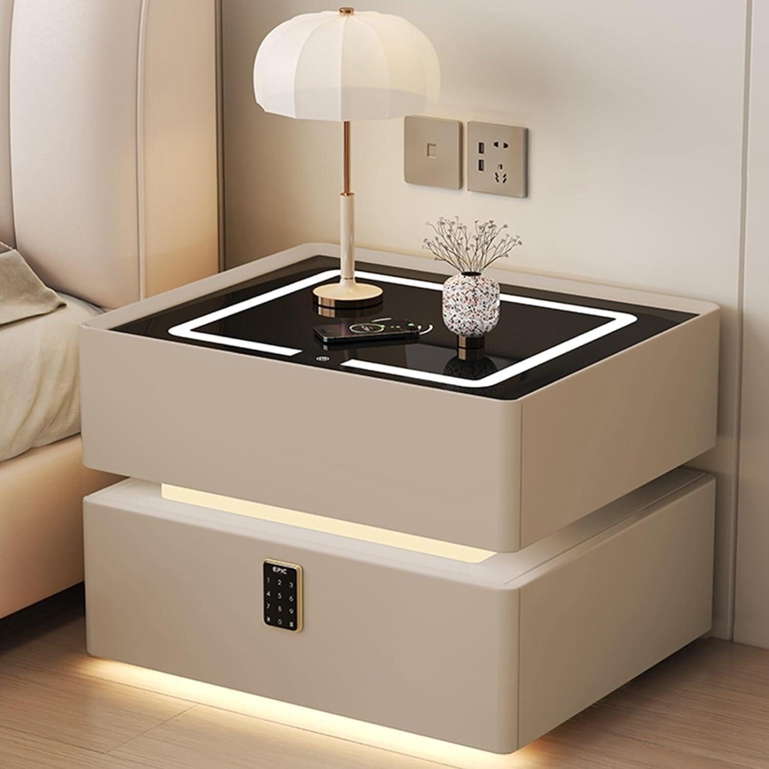 Introducing our innovative smart bedside table, designed to elevate your bedroom experience with unparalleled functionality and style. Say goodbye to cluttered cables and connectors with the built-in wireless charging feature, allowing you to effortlessly charge your smartphone by simply placing it on the table.Experience convenience and comfort with the motion sensor lighting, which softly illuminates the area when you approach and automatically dims when you leave, creating a tranquil ambiance for restful sleep. Crafted from a robust wooden frame wrapped in imported ultra-fine leather, this bedside table combines durability with elegance. The toughened glass tabletop adds a touch of sophistication while being resistant to scratches and easy to clean.Security is paramount, and our smart bedside table offers peace of mind with a password-protected drawer, providing secure storage for your personal belongings. With ample storage space and a sleek design, this bedside table seamlessly integrates into any space, from bedrooms to dining rooms, hallways to offices, enhancing both functionality and aesthetics.Upgrade your living space with our multifunctional smart bedside table, where innovation meets elegance. Experience the perfect blend of technology, craftsmanship, and design, making it an essential piece of furniture for modern living.